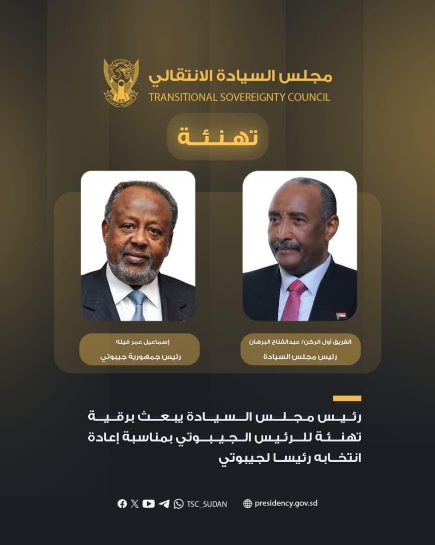 البرهان يهنئ رئيس جيبوتي بإعادة انتخابه ويؤكد تعزيز العلاقات الثنائية